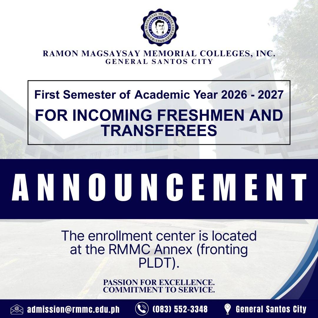 ππ‘π‘π’π¨π‘πππ ππ‘π§! The entrance and scholarship examination for incoming freshmen, as well as the entrance examination for transferees, are now open for walk-in applicants starting today, April 20, 2026. Please see the attached photo for the detailed time schedule. The entrance examination will be held at the RMMC-Annex / Senior High School Building at Beatiles Street, General Santos City (fronting PLDT), in rooms RA113 and RA114. Additionally, the results of the entrance and scholarship exams for previous months are now available at the RMMC Guidance Office, located at the RMMC Main CampusβPioneer Avenue, General Santos City. We look forward to seeing you there! #RMMCGensan #EnrollNow #RMMCEnrollment #PassionForExcellence #CommitmentToService