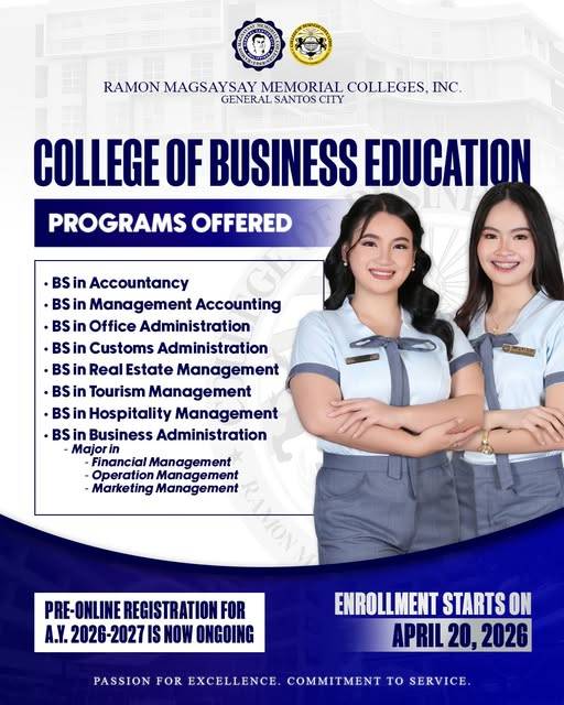 πππππ ππππ π πππππ ππ ππππππππ ππππ ππππ-ππππππ! Step into the world of opportunities with the College of Business Education of Ramon Magsaysay Memorial Colleges, Inc. β General Santos City. Designed to develop future entrepreneurs, leaders, and industry professionals, our programs equip you with the skills to thrive in todayβs competitive business landscape. π€π Programs Offered: BS in Accountancy BS in Management Accounting BS in Office Administration BS in Customs Administration BS in Real Estate Management BS in Tourism Management BS in Hospitality Management BS in Business Administration β Major in Financial Management β Major in Operations Management β Major in Marketing Management At RMMC-Gensan, we provide practical learning, industry exposure, and career-ready training to help you succeed in business and beyond. π Pre-Online Registration for A.Y. 2026β2027 is NOW OPEN! π Enrollment starts on April 20, 2026 Take charge of your future, enroll now and become a leader in the business world! #RMMCGensan #RMMCEnrollement #PassionForExcellence #CommitmentToService